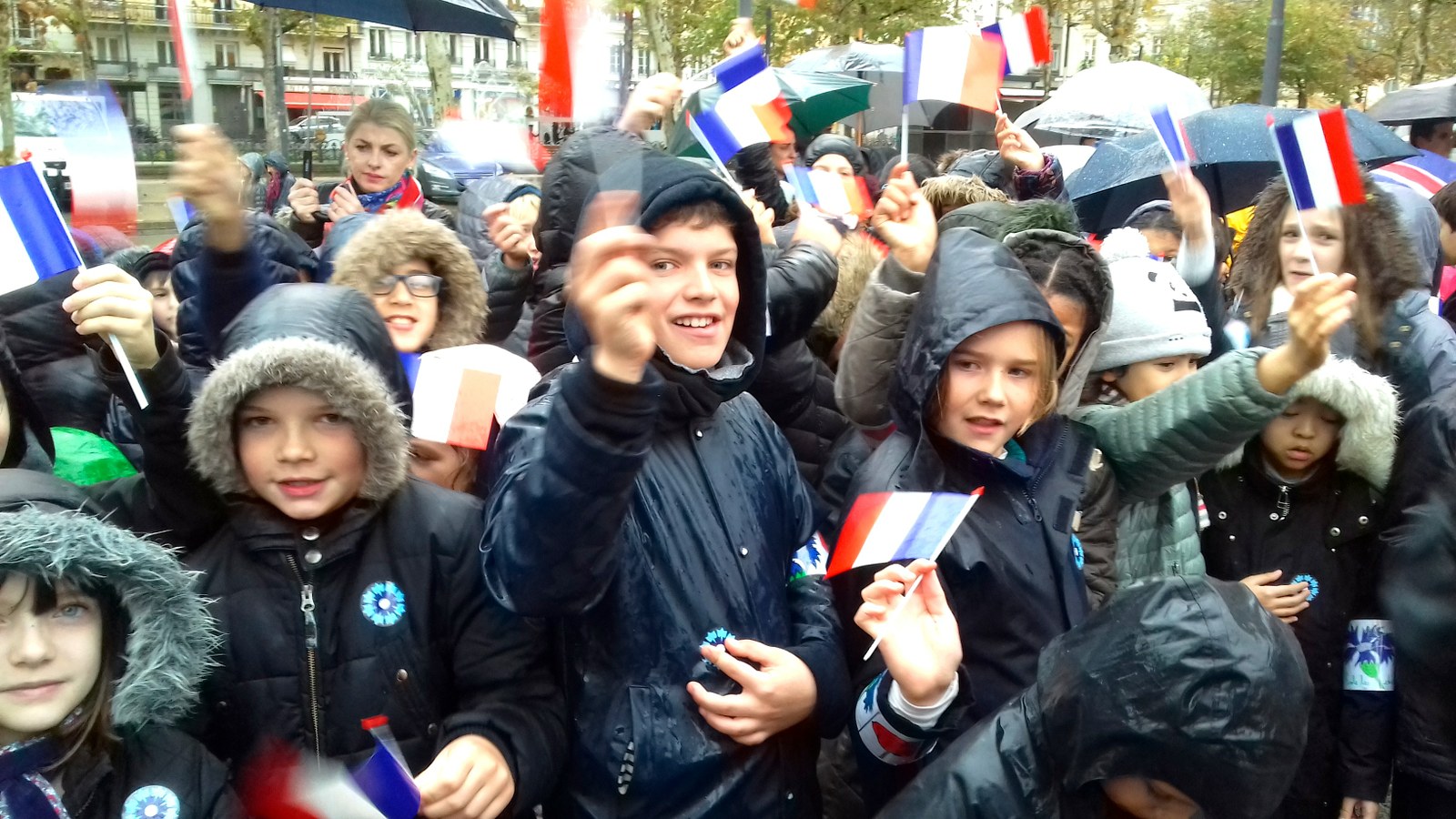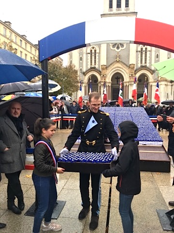 Avant que Monsieur le Maire, Gaël Perdriau, ne dépose une gerbe de fleurs devant la statue de Jean-Jaurès, environ un millier d’élèves de différentes écoles de la ville était réuni devant la cathédrale pour déposer des boîtes de bleuets de papier, fleur symbole des Poilus, sur lesquelles étaient inscrits les noms des soldats stéphanois tombés au combat.