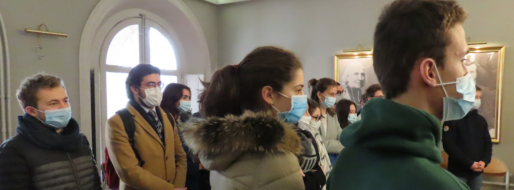 Rassemblement des étudiants au Parloir pour les remerciements du Père Plessy