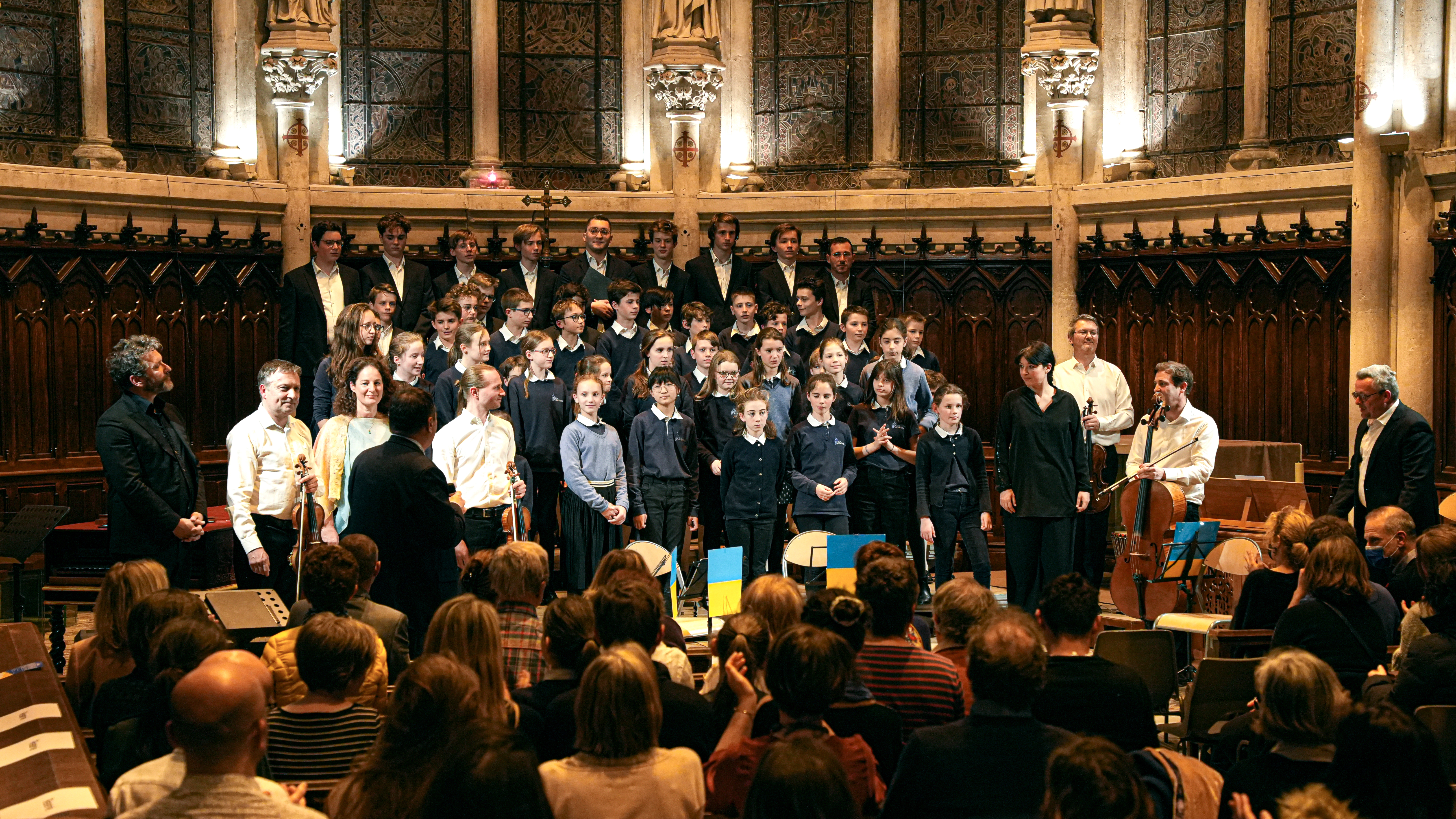 Organisé à l’initiative de Cédric Conchon, parent d’élèves et membre du Quatuor Debussy, Caroline Mutel et Sébastien d’Hérin de l’ensemble Les Nouveaux Caractères, la Maîtrise et la Schola des Chartreux, le Concert pour l’Ukraine et pour ceux qui veulent la paix a eu lieu le 12 avril dans la chapelle de l’Institution. Vous avez été nombreux à y assister. Un immense merci pour votre générosité.