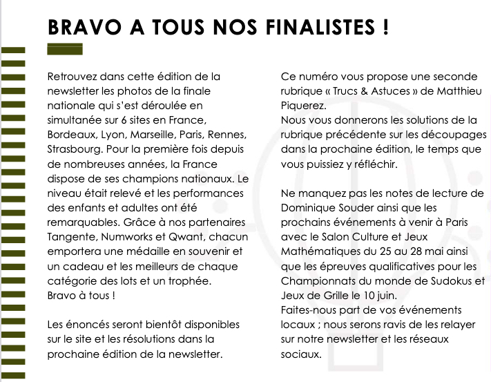 La fédération française des jeux mathématiques vient de lui demander de représenter la France lors de la finale internationale qui aura lieu le 25 août en Pologne.