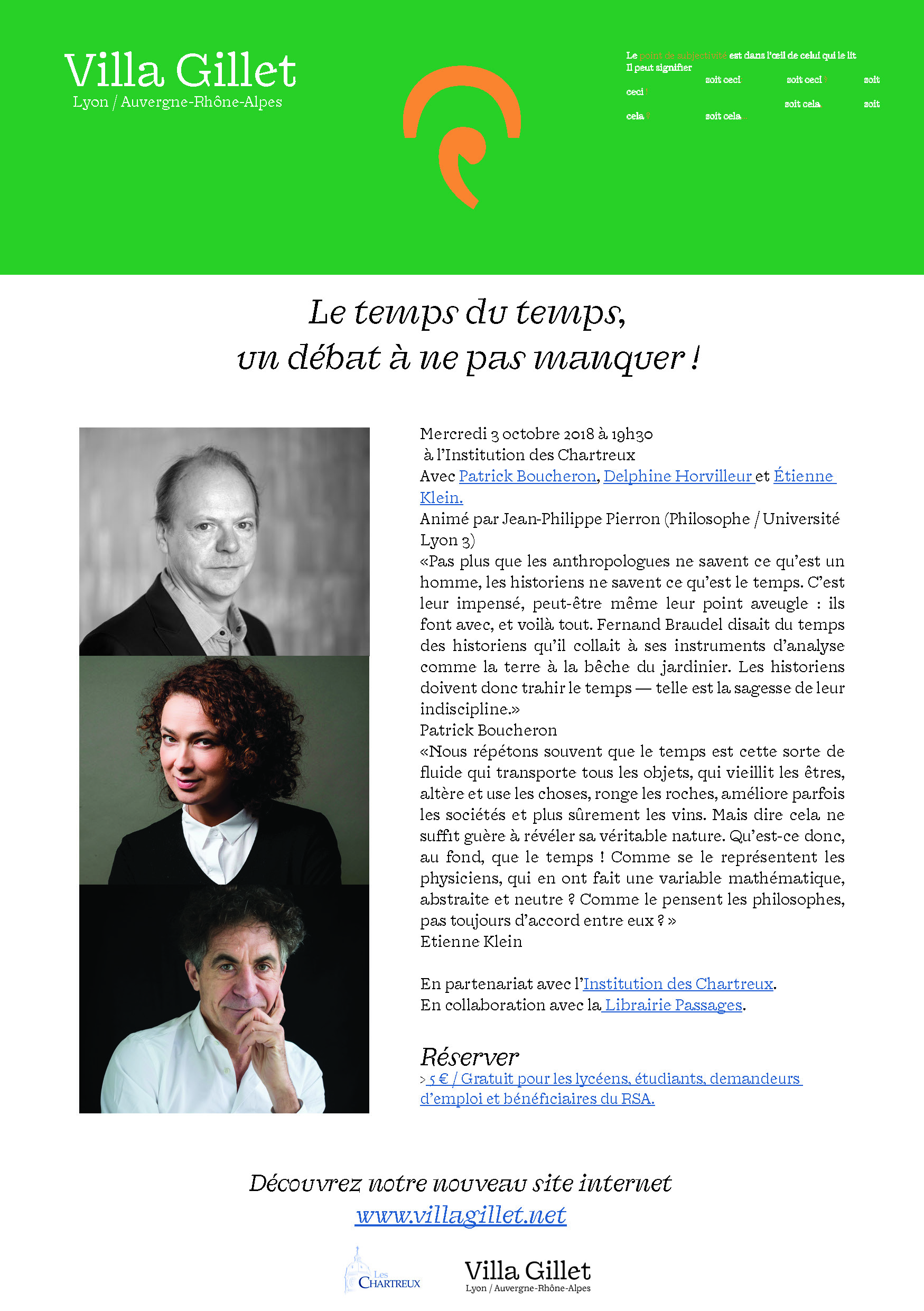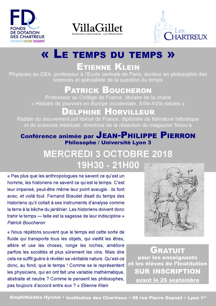 OUVERTURE CULTURELLE. CONFÉRENCE en partenariat avec la Villa Gillet. "Le temps du temps" avec Étienne KLEIN, Patrick BOUCHERON, Delphine HORVILLEUR.