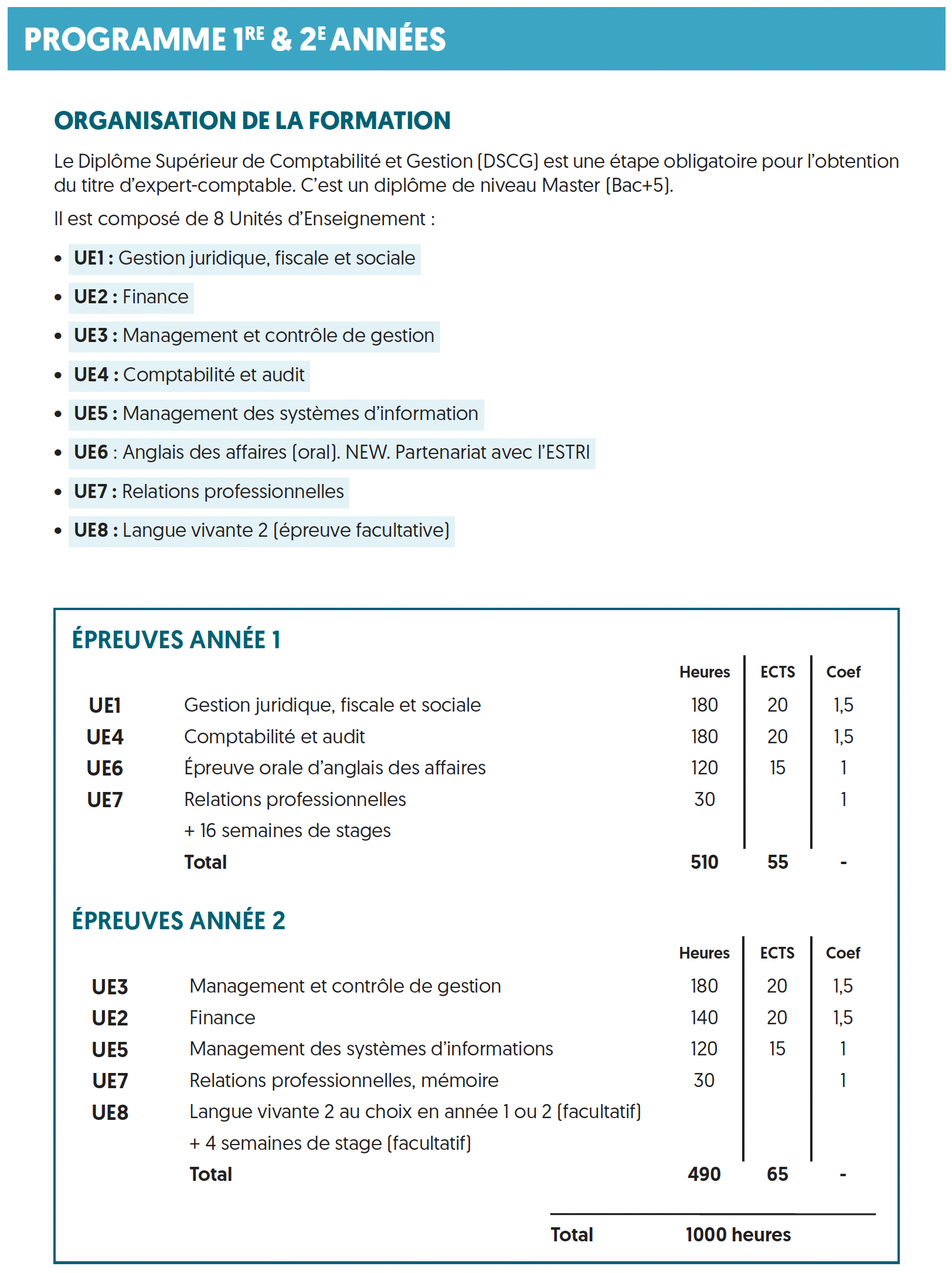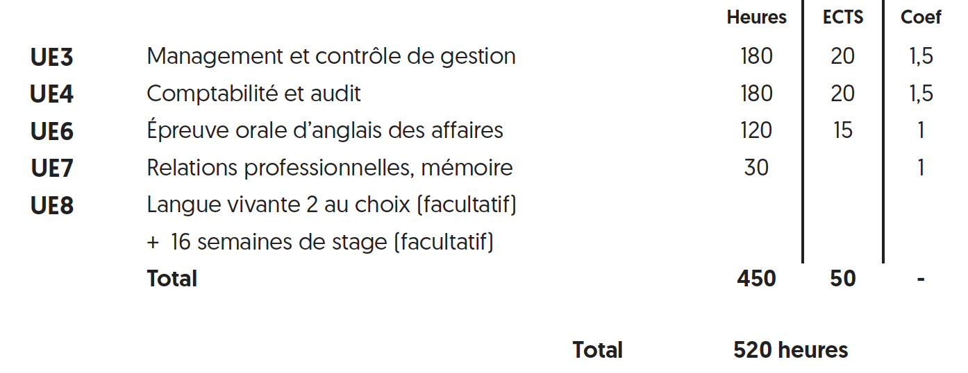 Cette formule s'adresse aux étudiants ayant passé et obtenu le DCG et également validé par ailleurs les UE2 (Finance) et l'UE5 (Management des systèmes d'information).