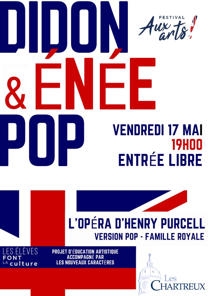 Vendredi 17 mai 2024, entrée libre pour l'ouverture de la 4e édition du festival AUX ARTS ! avec le grand projet pédagogique accompagné par l’ensemble Les Nouveaux Caractères en résidence aux Chartreux : une version pop/famille royale de Didon et Énée qui promet d’être « so british ».