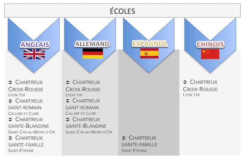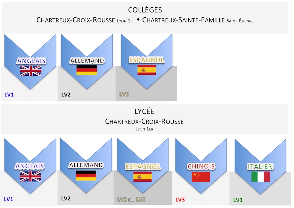 L'ensemble des cinq langues enseignées dans les établissements du groupe des Chartreux sont accessibles à l'ensemble de nos élèves. Qu'ils choisissent de suivre un cursus spécifique (bilingue ou bilangue) ou une filière indifférenciée.